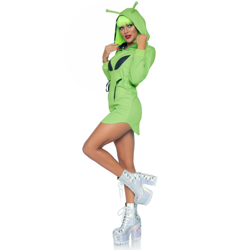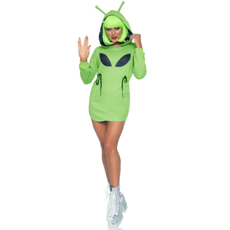 Sie' In diesem grünen Fleece-Minikleid mit Alien-Print, langen Ärmeln, angenähter Kapuze mit himmlischem Print Futter und doppelter Cinched-Front siehst du bequem aus dieser Welt. (Perücke nicht enthalten.)